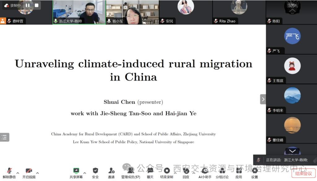 4月26日,由西安交通大学公共政策与管理学院、资源与环境治理研究中心主办的第十二期“资源与环境治理系列讲座”以线上形式开展。本期讲座由浙江大学公共管理学院陈帅教授主讲,讲座题目是Unraveling climate-induced rural migration in China,资源与环境治理研究中心副主任杨小军副教授主持本期讲座。
