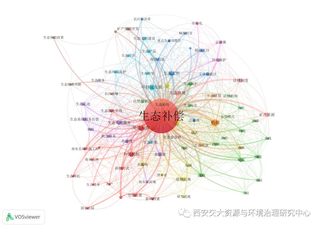 利用VOSviewer软件,以关键词为节点进行分析得到网络可视化图(图2)。节点圆圈大小代表关键词出现的频率,连线代表关键词出现在同一个文献,连线粗细是关键词同时出现的频率。还能得到叠加可视化图(图3),不同的颜色和右下角的色带所对应的是平均发布的年份,可以看出,近年来研究热点集中于黄色节点,即“市场化”、“生态产品”、“生态系统服务价值”、“精准扶贫”。